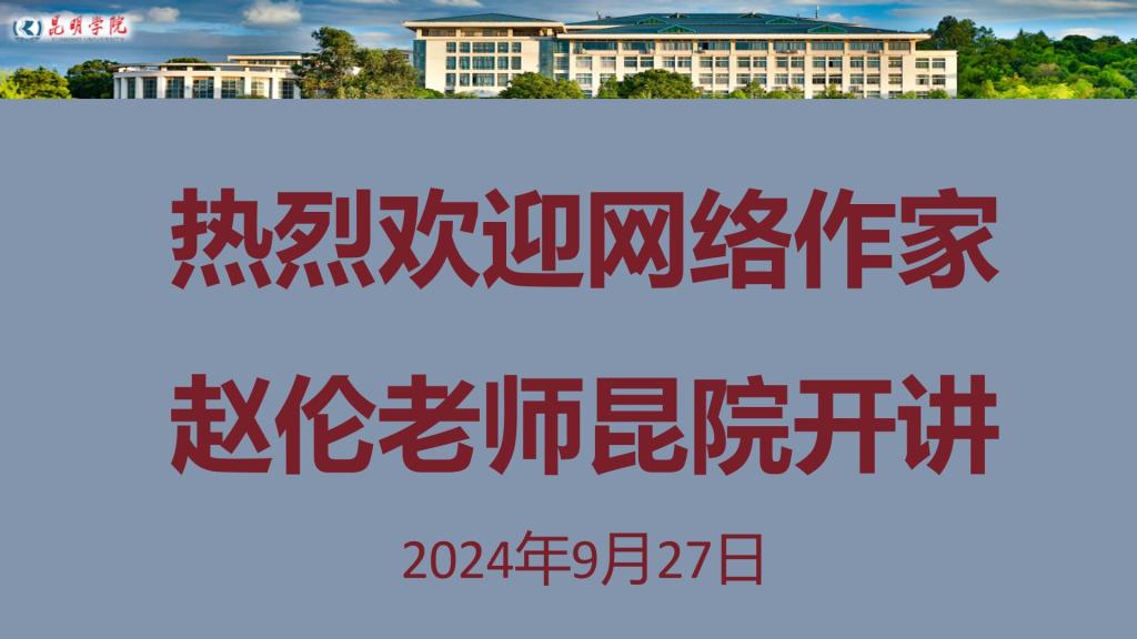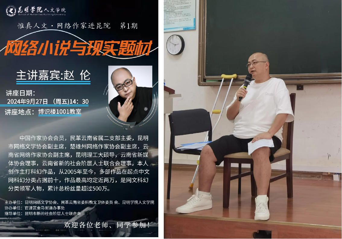 2024年9月27日,由威廉希尔中国官网承办的“惟真人文·网络作家进昆院”系列讲座第一期在博识楼1001教室举行。第一期讲座由赵伦(黑天魔神)老师主讲。赵伦老师是中国作家协会会员、民革云南省属二支部主委、昆明网络文学协会副主席,也是“昆明市网络作协作家进校园”公益讲座活动的发起人,已经连续多年组织昆明网络文学协会作家到全省各大中小学开展公益讲座,积极推动云南网络文学的创作和推广。