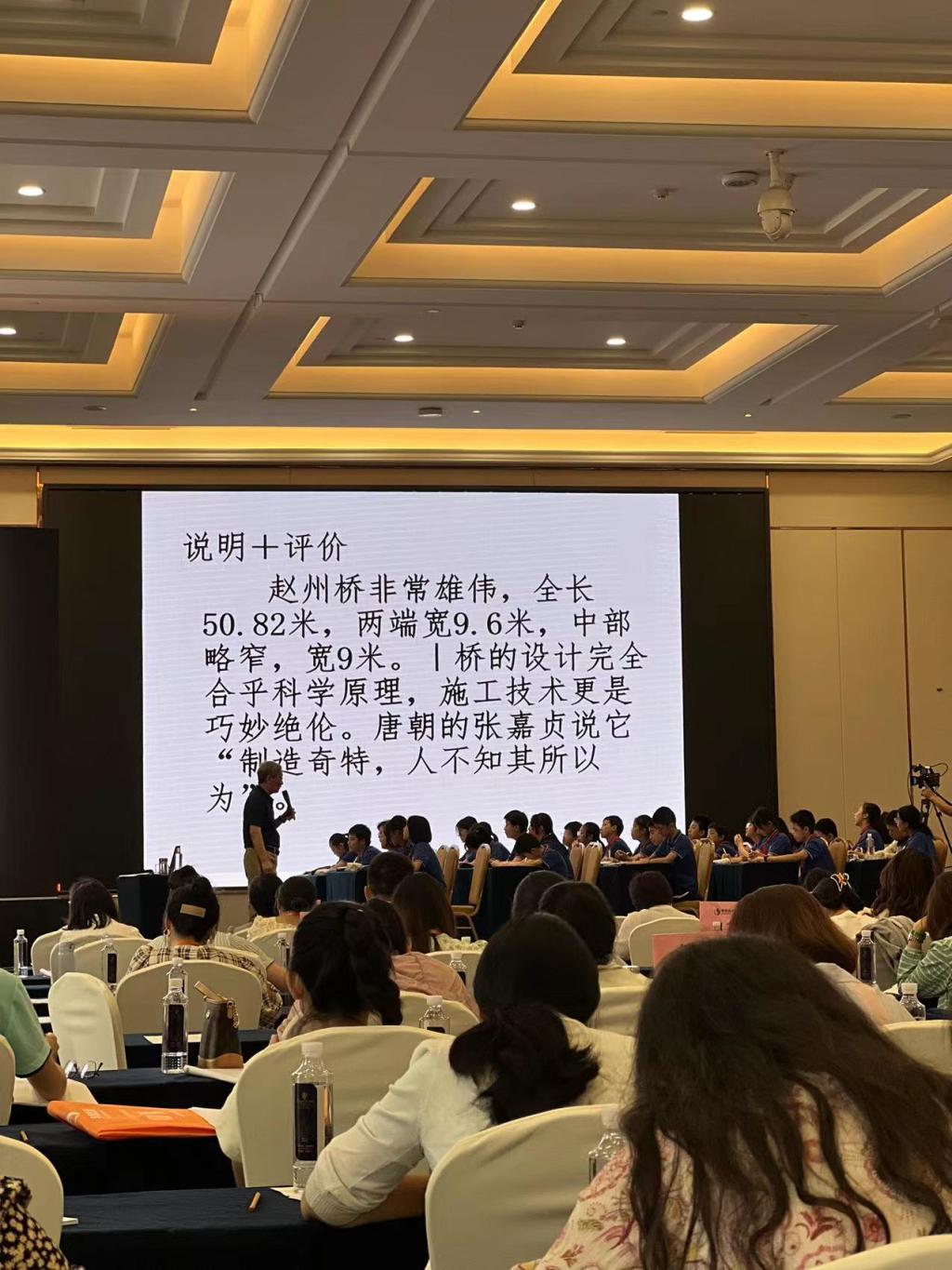 首先,余映潮老师利用全新的教学理念,全新的教学设计,展示了一节有趣的说明文示范课——《中国石拱桥》。他利用文本训练员工思维,提升员工阅读能力的方式展开教学。围绕六个“6分钟”,依次展开“6分钟听讲记录”“6分钟词句品读”“6分钟精彩段落”“6分钟课堂交流”“6分钟语例观察”“6分钟仿写学用”,教学设计实属别有洞天。在《中国石拱桥》的执教中充分体现了高效课堂阅读教学的技能高标:利用教材,集体训练,语言学用、技能训练、知识渗透;板块思路、主问引领、给予时间、动笔读写、当堂落实。
