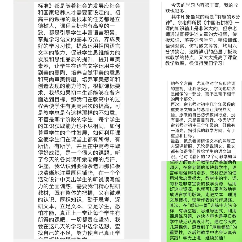 余老师,用他青春不败的70后的教育情怀,用他的坚韧和勤奋,惜时如金的教研精神,用他量大多产的教学著述和实践,更用他的“板块教学艺术”的智慧影响、成就了一批又一批中青年语文教师。一天的学习,老师们的心中已是跌宕起伏,久久不能平静,