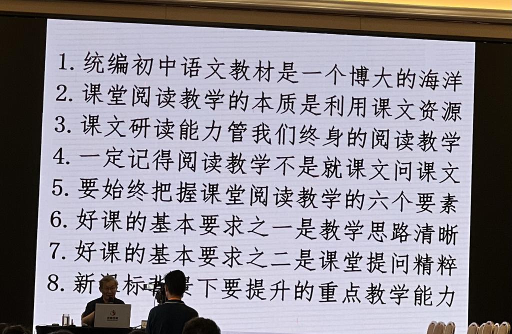 接下来余映潮老师从宏观上为大家搭建理论框架。在《练高效阅读教学的本领》讲座中说到语文教师怎样提高阅读教学的本领的八个关注点:一、统编初中语文教材是一个博大的海洋二、课堂阅读教学的本质是利用课文资源三、 课文研读能力管我们终身的阅读教学四、一定记得阅读教学不是就课文问课文 五、要始终把握课堂阅读教学的六个要素 六、好课的基本要求之一是教学思路清晰七、好课的基本要求之二是课堂提问精辟八、新课标背景下要提升的重点教学能力。