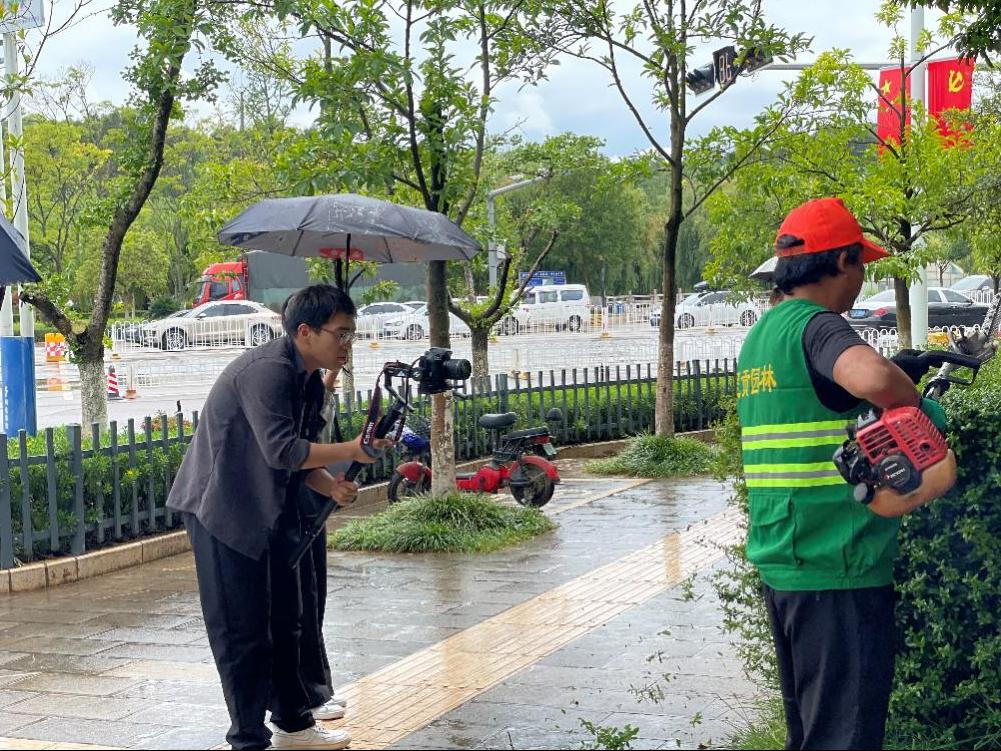 “在雨中采访绿化工人,我们锻炼了采访能力,也锻炼了我们作为准新闻人风里雨里,奔赴现场的新闻精神。”2019级广电新闻专业的朱薇同学说到。