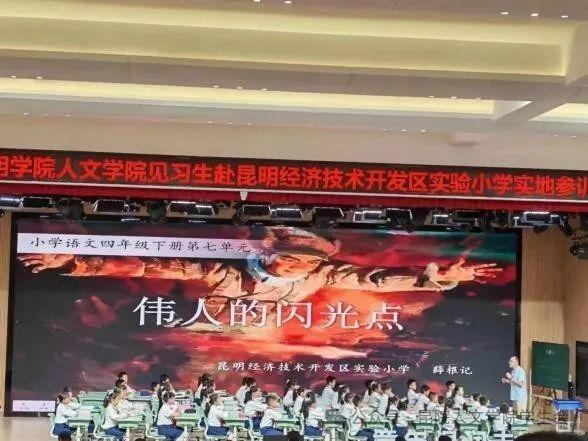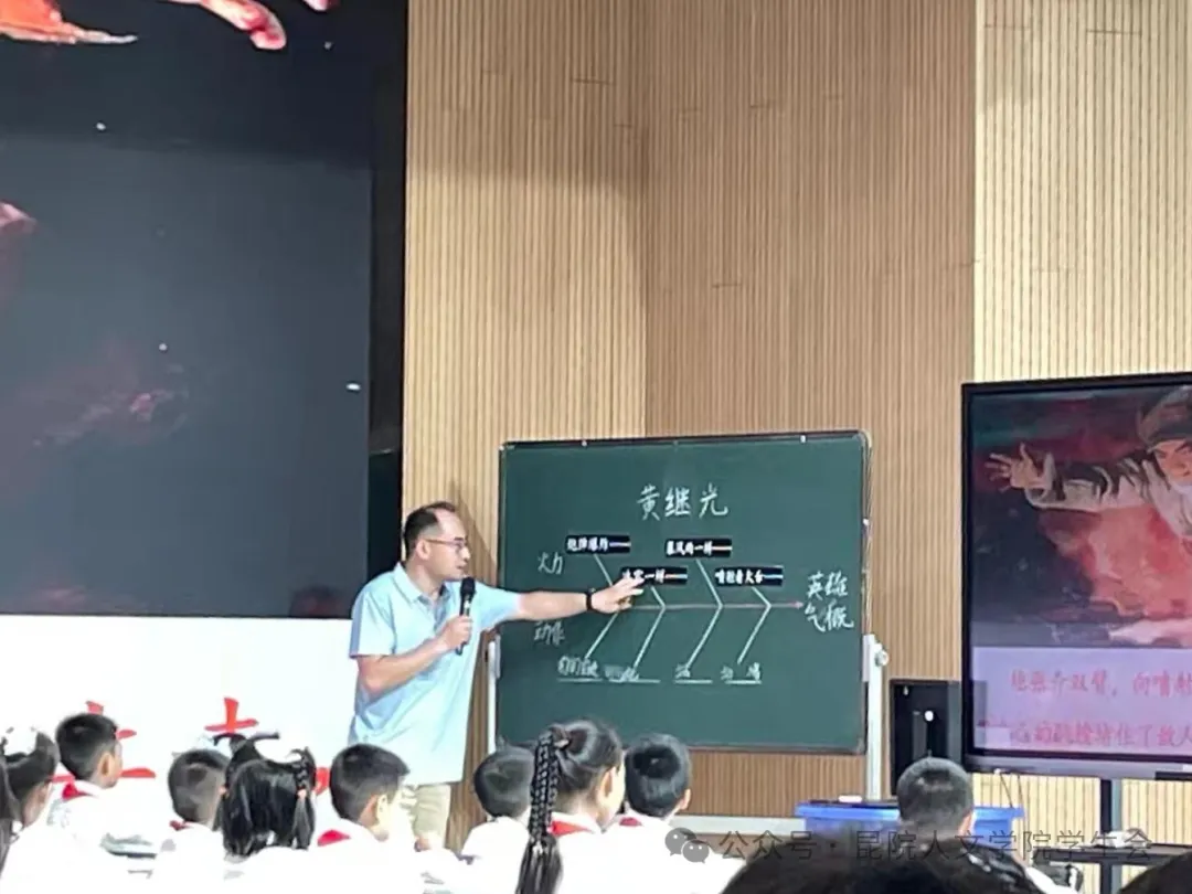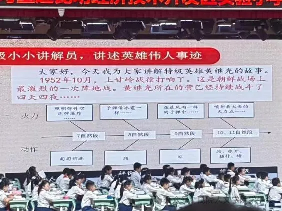 首先,第一节课由薛根记老师为我们带来《黄继光》的示范课。薛老师以班级伟人馆进行切入,带领同学们回顾之前学习过的王冕、王昌龄等人物,又以视频导入的形式,将时间拉回到抗美援朝战争,引入今天的课堂《黄继光》。