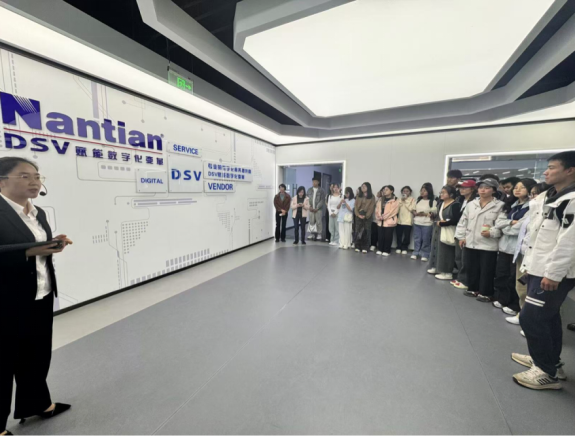 同学们在南天软件业务集团昆明开发中心解决方案与咨询部经理杨蔚和讲解员的带领下参观了展厅。展厅分为发展历程、解决方案区、企业文化区三个板块,全方位立体化向同学们展示了公司的相关信息。