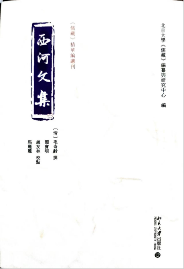 《西河文集》为国家社会科学基金重大项目、教育部哲学社会科学研究重大课题攻关项目“《儒藏》精华编”的子项目之一,是对清代学者毛奇龄的著作《西河文集》的整理、校点,作为“《儒藏》工程”的一部分,是对儒家典籍的整理和传承,为学者进一步研究相关儒家文化思想及清代学术史提供基础资料。