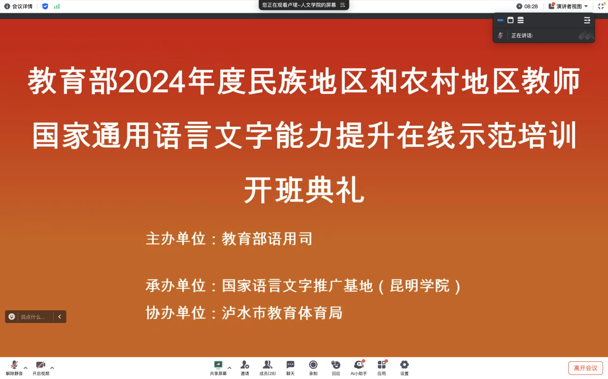 9月20日下午,由教育部语用司主办、公司国家语言文字推广基地承办、泸水市教育体育局协办的“williamhill官网对口泸水市教师开展国家通用语言文字能力提升在线示范项目”正式启动。泸水市教育体育局与50位培训学员同williamhill官网的27位教辅团队成员共聚云端,举办开班仪式。时值我国第27届全国推广普通话宣传周之际,williamhill官网携手地方民族地区,共同响应推普周“加大推普力度,筑牢强国语言基石”活动主题,以实际行动助力国家通用语言文字的高质量推广普及。