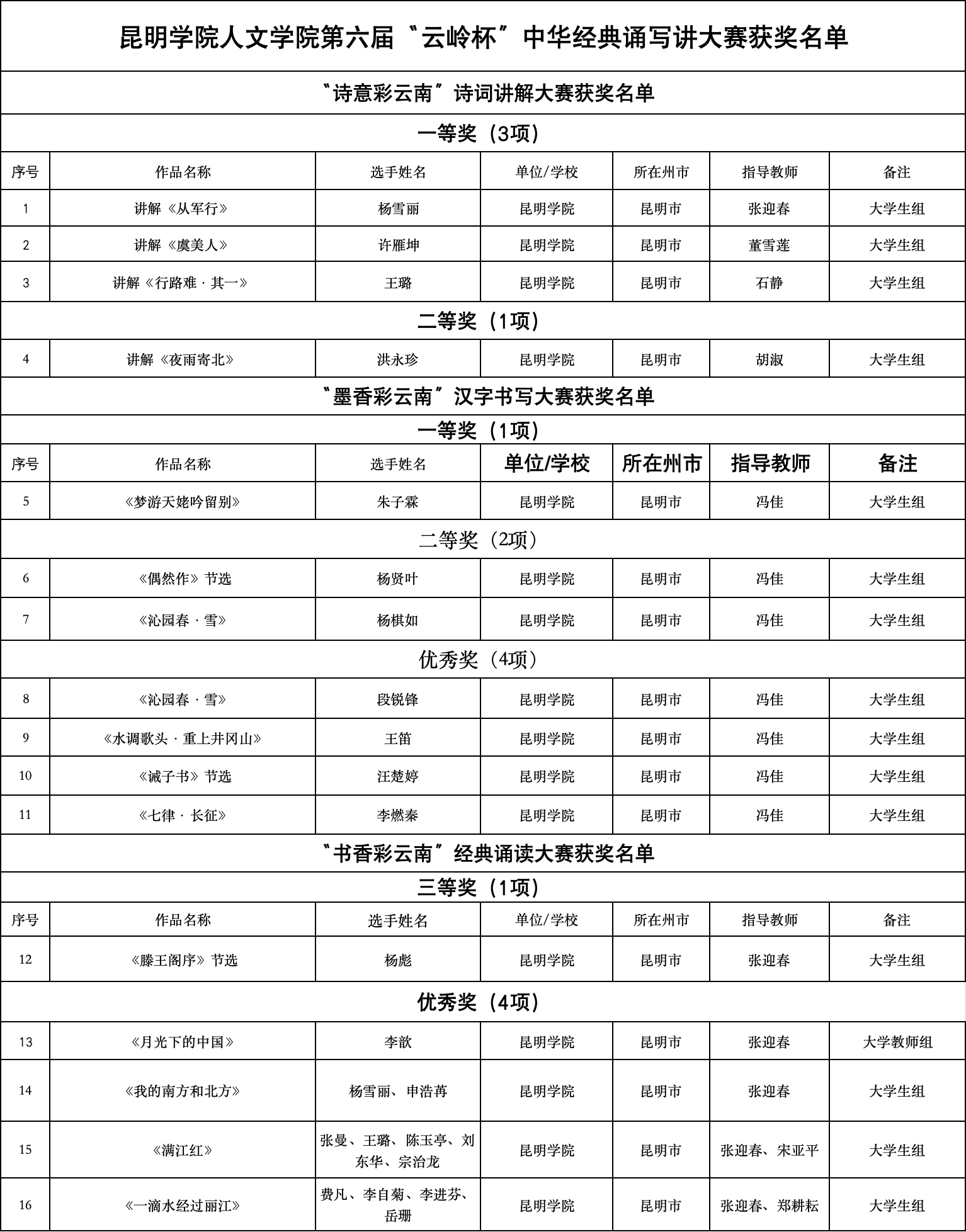 根据《教育部办公厅关于举办第六届中华经典诵写讲大赛的通知》(教语用厅函〔2024〕2号)要求,由云南省语言文字工作委员会、云南省教育厅主办,云南广播电视台、云南财经大学、昆明信息港具体承办,云南出版集团协办的第六届“云岭杯”中华经典诵写讲大赛省赛结果出炉,公司推荐参加省复赛的17组作品中,16组作品获奖,其中省级一等奖4项、二等奖3项、三等奖1项、优秀奖8项,再次取得佳绩!