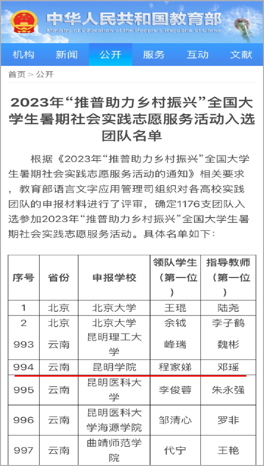 近日,教育部官网公布了2023年“推普助力乡村振兴”全国老员工暑期社会实践志愿服务活动入选团队名单,公司省级国家通用语言文字推广基地项目执行负责人邓瑶教授带队指导的“williamhill官网赴西双版纳勐遮镇推普助力乡村振兴服务队”成为公司唯一入选团队。该项活动由教育部语用司联合团中央青年发展部共同举办,旨在深入学习贯彻落实党的二十大精神,加大国家通用语言文字推广力度,服务铸牢中华民族共同体意识。