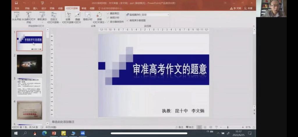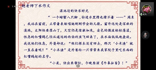 6月26日晚上,云南财大附中赵玲老师为同学们带来《初中作文教学的思考一实践——以2022年云南省及昆明市中考为例》。赵老师首先教同学们如何审题和半命题作文如何补题,文章如何结构,然后赵老师与同学们分享了她自己练手的中考作文“滇池边的快乐风光”。赵老师强调在教写作的过程中,不能只是传授写作知识,还要多下水练笔,起到带头和示范作用,也要在写作时多借鉴名家的范文,用心感受生活,多挖掘新题材。