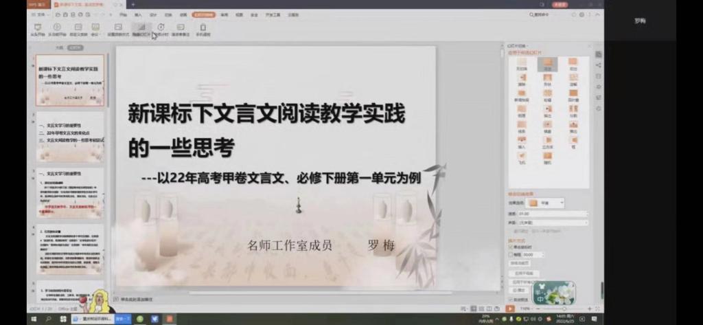 6月25日上午,邓瑶名师工作室成员罗梅、禄劝一中罗梅老师为同学们讲解了《新课标下文言文阅读的实践与思考》。罗老师认为:文言文教学在新课标指导下存在多个学习任务群,教师应该运用这些任务引导员工积累经验形成文化自信。我们要在牢固掌握基础知识的基础上,提升课外阅读,做到腹有诗书气自华;针对一词多义、词类活用、古今异义等文言知识,要通过联想与对比,融汇贯通,系统掌握。罗梅老师强调:在核心素养背景下,教师教学应从“语言”出发,用“思维”和“审美”做桥梁,教到“情感、思想、文化”的根上。