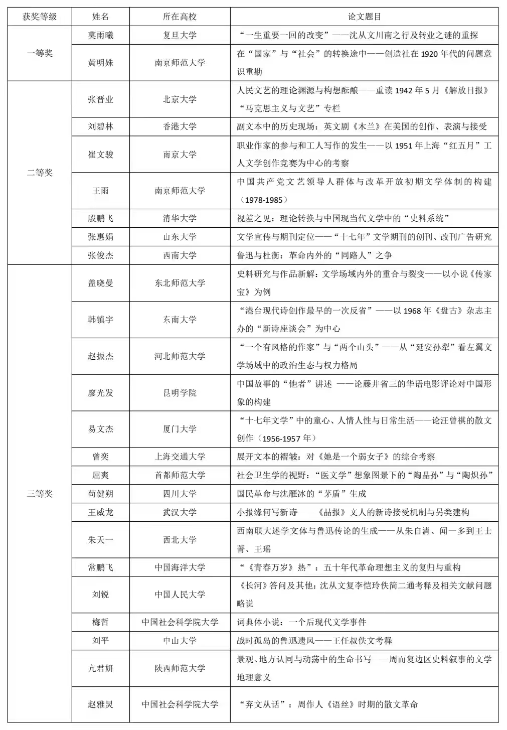 本次论坛由南京师范大学文公司、中国现当代文学国家重点学科、教育部人文社会科学重点研究基地南京大学中国新文学研究中心和《扬子江文学评论》杂志共同主办。来自全国各地高校的研究生提交论文参加遴选。最终,包括香港大学及北京大学、清华大学、复旦大学、中国社科院大学等23所高校的36位硕博研究生入选本次论坛。最终评选出一等奖2名,二等奖7名,三等奖11名,优秀奖16名。