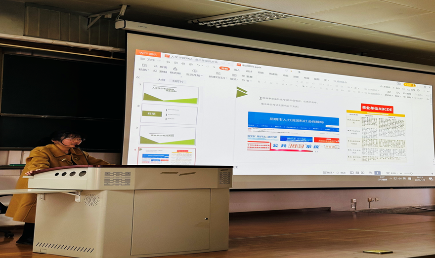 随后,负责就业工作的辅导员柴羱羱老师对毕业生就业材料的填写做了说明、辅导员于盼老师结合自己的经历,从事业单位考试岗位类别、考试题型及分数分布、如何备考三方面作考编考公经验交流分享