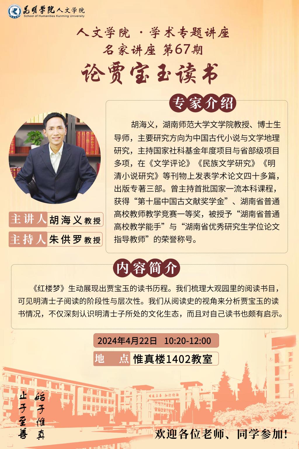 第二场讲座由胡海义教授主讲,题为《论贾宝玉读书》。胡教授从宝玉读什么书、宝玉怎么读书、宝玉读书的启示三个方面,逐层梳理剖析,清晰呈现了清代士子读书学习的样貌,为小切口的文史融合型专题研究做好很好的示范。胡教授还勉励昆院学子要珍惜时光,在阳光明媚的春城昆明多读书、读好书,为未来奠基蓄力。