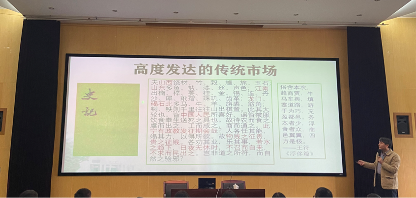 黄国信教授从高度发达的传统市场与古典经济学市场逻辑开始讲起,他首先引用《史记·货殖列传》中的史料向大家简单介绍了古代中国的市场特色,各区域的特色产品往往集中于中原的市场进行销售,自发的商业活动早已是一种普遍的现象,而自发的商业活动是由百姓自己的经济理性的形成而发展起来的。