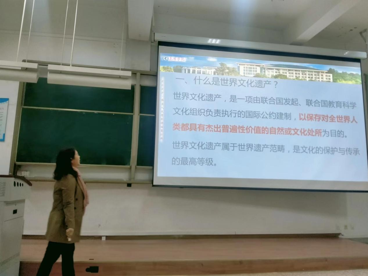 谈及中国的世界文化遗产,田玉玲老师为同学们着重介绍了云南省以丽江古城、“中国南方喀斯特”和澄江化石地为代表的五项世界自然与文化遗产项目,剖析世界遗产项目的三项未来挑战:代表性、可及性和可持续性。田老师由点及面,由浅入深的讲解,给了同学们一个相当开阔的视野去了解世界自然与文化遗产。