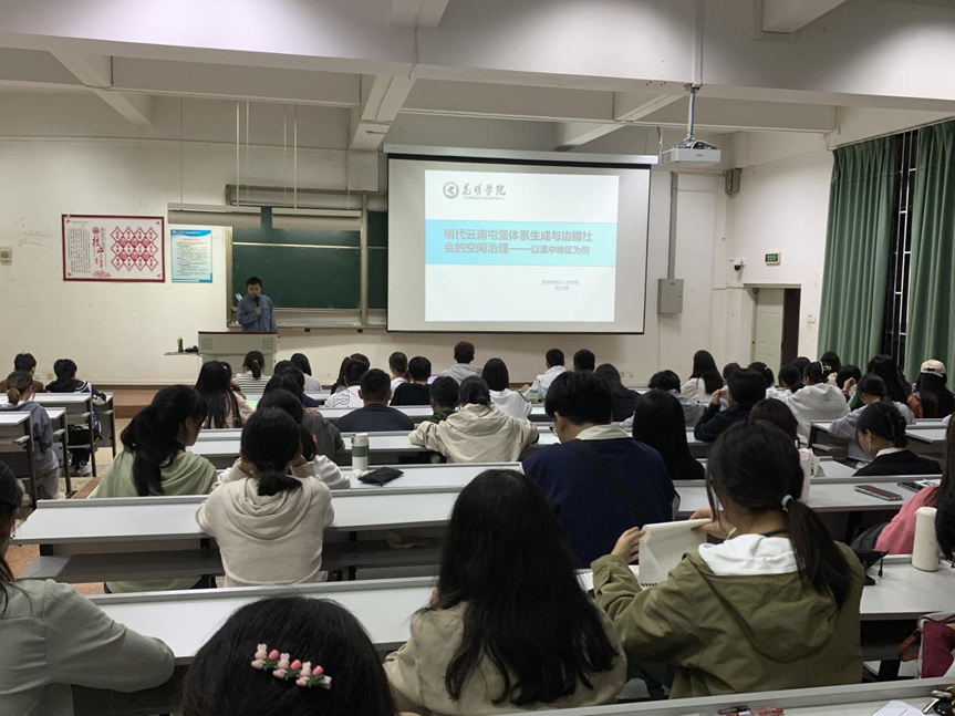 陈老师用图文并茂的方式给同学们展示了明代屯堡体系的中起到安全保障作用的关隘、哨墩、巡检司等山乡警戒系统,起网络构建作用的驿站、铺舍等信息和物资传输体系,让同学们对卫所制之下集军事防御、屯田与民居于一体的防御型聚落形态——明代屯堡产生了浓厚的兴趣,并对卫所为核心十指连心、圈层联动、军民一体、夷汉相安的社会运作体系和边疆治理格局加深了认识。讲座的最后,陈老师落脚于强调研究云南屯堡文化对国家和世界的重要意义——其经验可借鉴于中华民族命运共同体和世界和平稳定局面的形成。