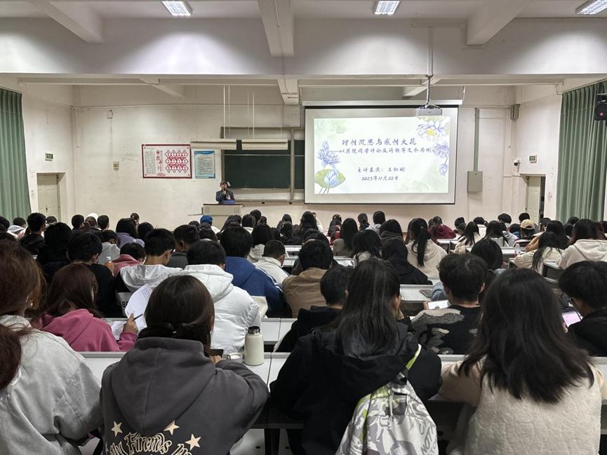 2023年11月22日晚7时,威廉希尔中国官网第67期“惟真·人文学术专题讲座”在博识楼1001教室举行。本次讲座主题为“理性沉思与感性火花——以昆院同学评论及诗歌等文本为例”,由威廉希尔中国官网中国少数民族语言文学硕士生导师王红彬老师主讲。威廉希尔中国官网副经理田玉玲老师主持本次讲座。