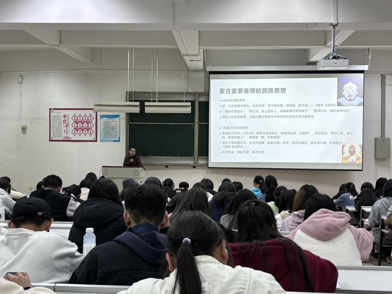 本次讲座,李征鸿博士先启发同学们思考“明朝与蒙古关系的实质”。接着,李征鸿博士讲解了明代蒙古族、蒙古重要首领也先与俺答汗、明代女真族、努尔哈赤与皇太极、明代西域各民族的民族思想,并对其历史缘由进行了梳理。