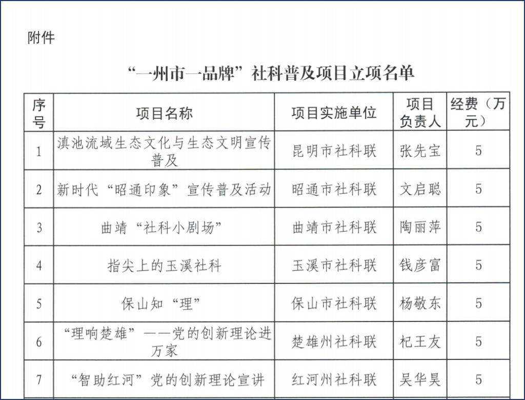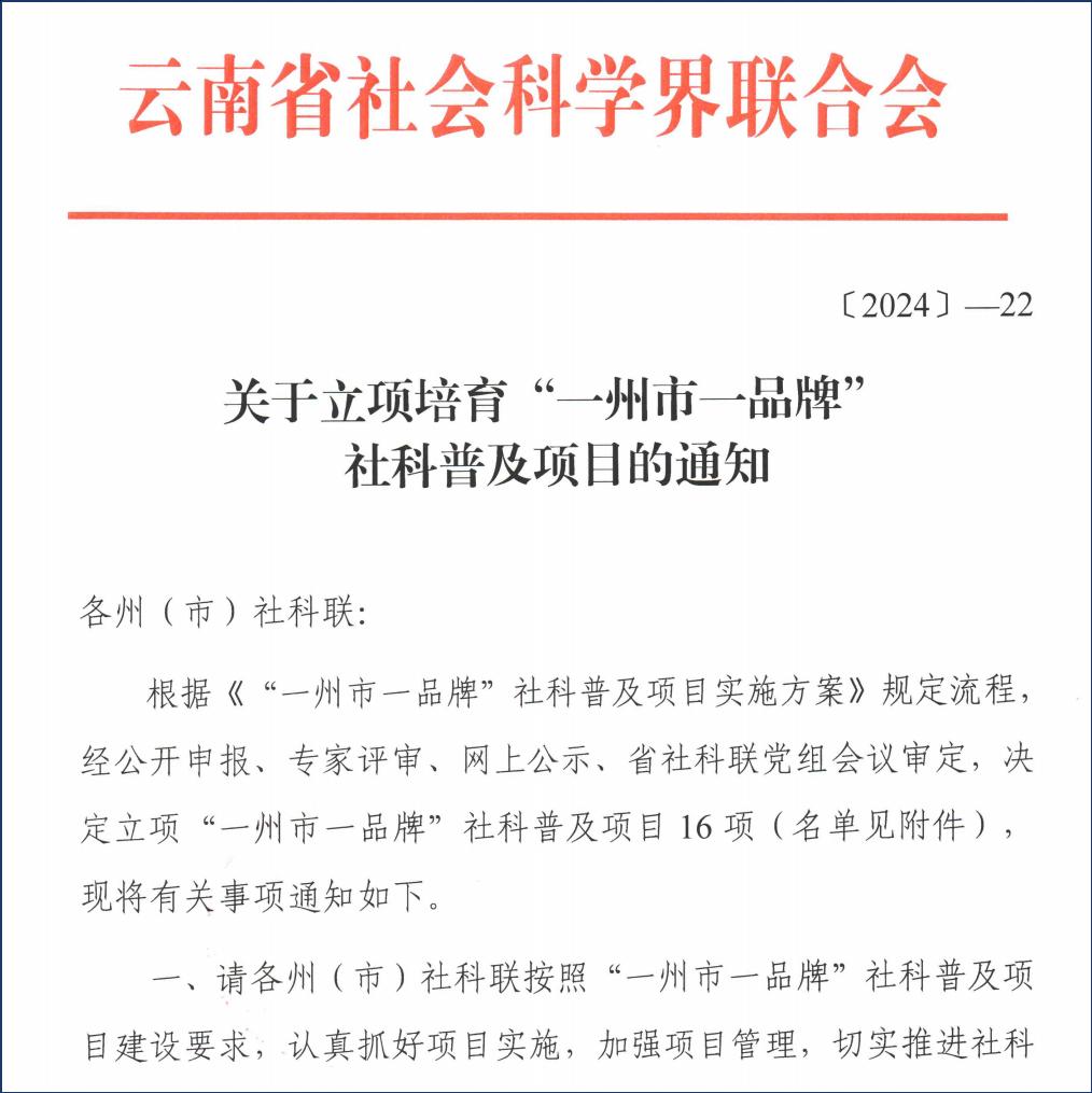 2024年2月,云南省社科联发布《关于“一州一市一品牌”社科普及项目申报的通知》(云社联【2024】10号)文件后,市科社联邀请公司田玉玲老师组织公司相关部门开展联合申报工作。在公司与滇池流域生态文化博物馆的大力支持下,“滇池流域生态文化与生态文明宣传普及”项目(科普阵地建设类)以排序第一的好成绩,顺利获得省社科联批准立项。本项目属于我省社科联首批“一州一市一品牌”社科普及项目,建设周期为3年,建设经费共15万元。