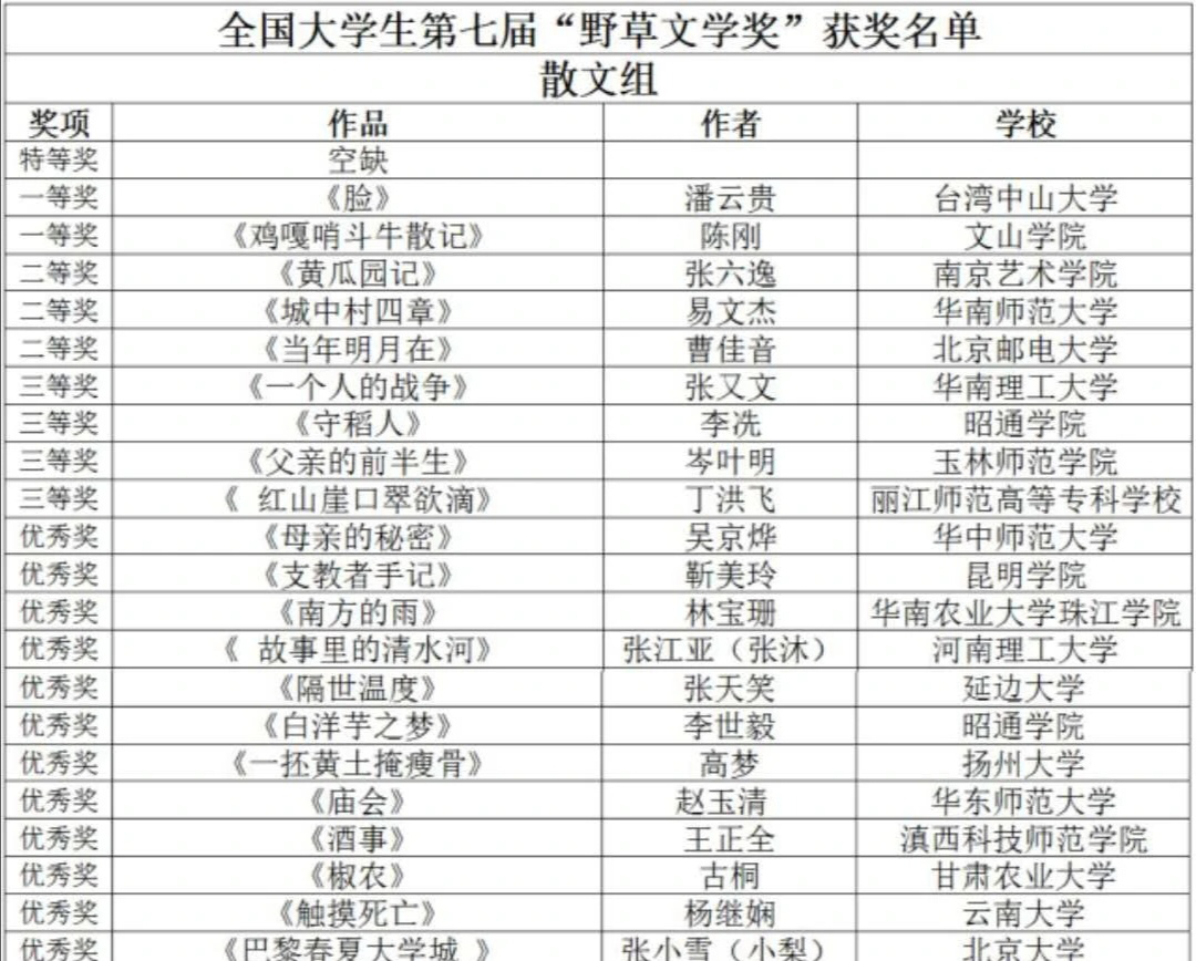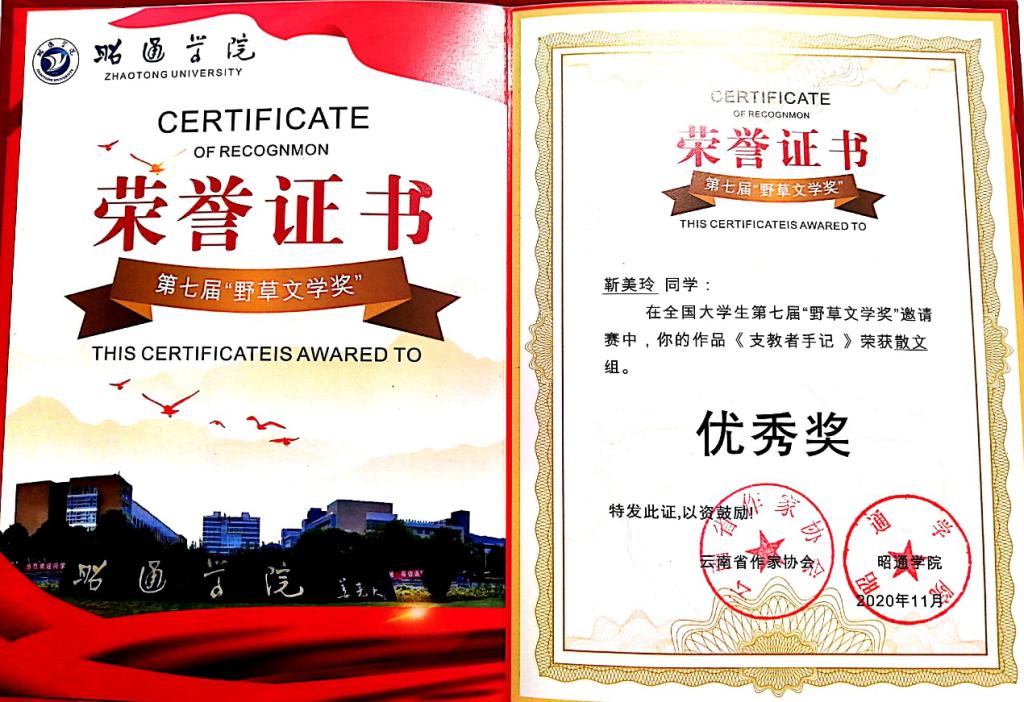 公司靳美玲同学(威廉希尔中国官网,20级中国语言文学研究生1班),在全国老员工第七届“野草文学奖”邀请赛中,凭作品《支教者手记》荣获散文组优秀奖。野草文学奖邀请赛自第四届以来由云南省作家协会和昭通公司联合主办,面向全国老员工征稿,迄今已成功举办七届。这是该文学赛事面向全国高校以来,公司员工第一次获奖。愿公司员工再接再厉,再创佳绩!
