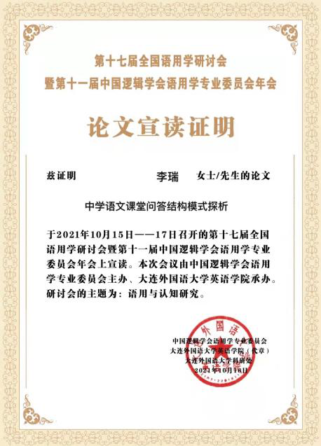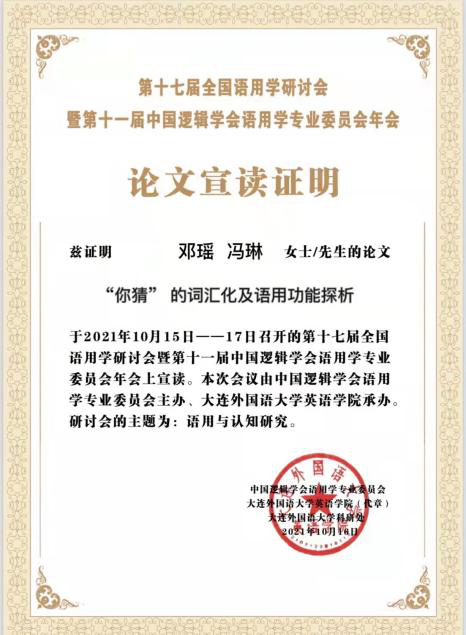 2021年10月15—17日由大连外国语大学英语公司主办的第十七届全国语用学研讨会暨第十一届中国逻辑学语用学会议顺利召开。中国逻辑学会语用学专业委员会旨在推广语用学研究成果,推动语用学理论及应用研究的发展,促进语用学团队建设和人才成长,为社会发展和市场经济的繁荣做出贡献。本次会议采用“线上+线下”的方式,威廉希尔中国官网邓瑶教授与2020级语言学及应用语言学两位研究生同学李瑞、冯琳参加了线上会议。