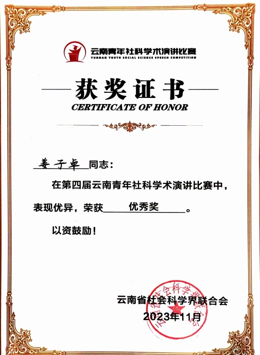 公司研究生姜子卓获云南省青年社科联演讲比赛优秀奖