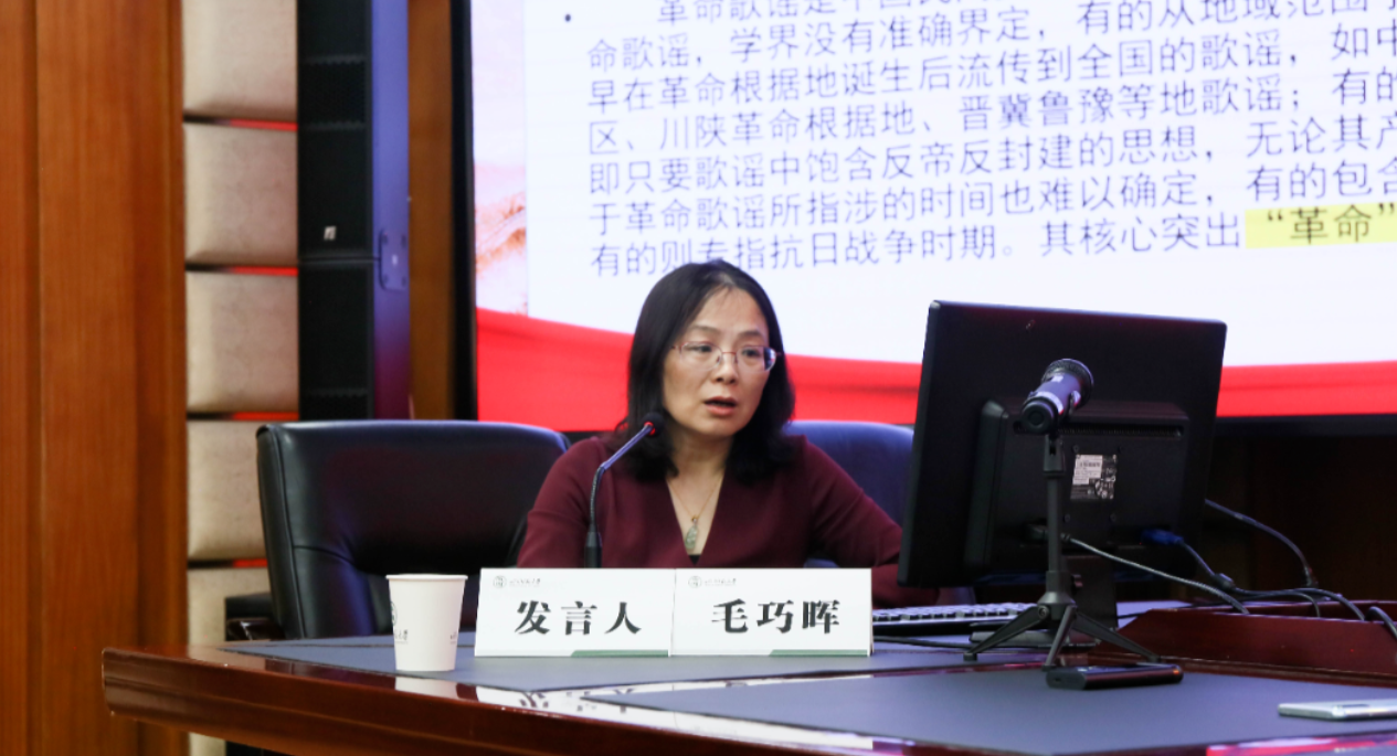 毛巧晖研究员以《革命歌谣文类生产(产生)、发展与当代传承》为题,首先梳理了“革命”的丰富涵义,指出其概念的发展变迁。随后结合大量民间文学史料剖析民间文艺与革命的结合历程,最后将话题引向当下热门的“非遗”,指出革命歌谣当代传承的关键问题是如何在具体实践中将革命歌谣还原到复杂的、长期的、互动的社会生活中,这也是文化传承、发展及传播共同面临的问题。