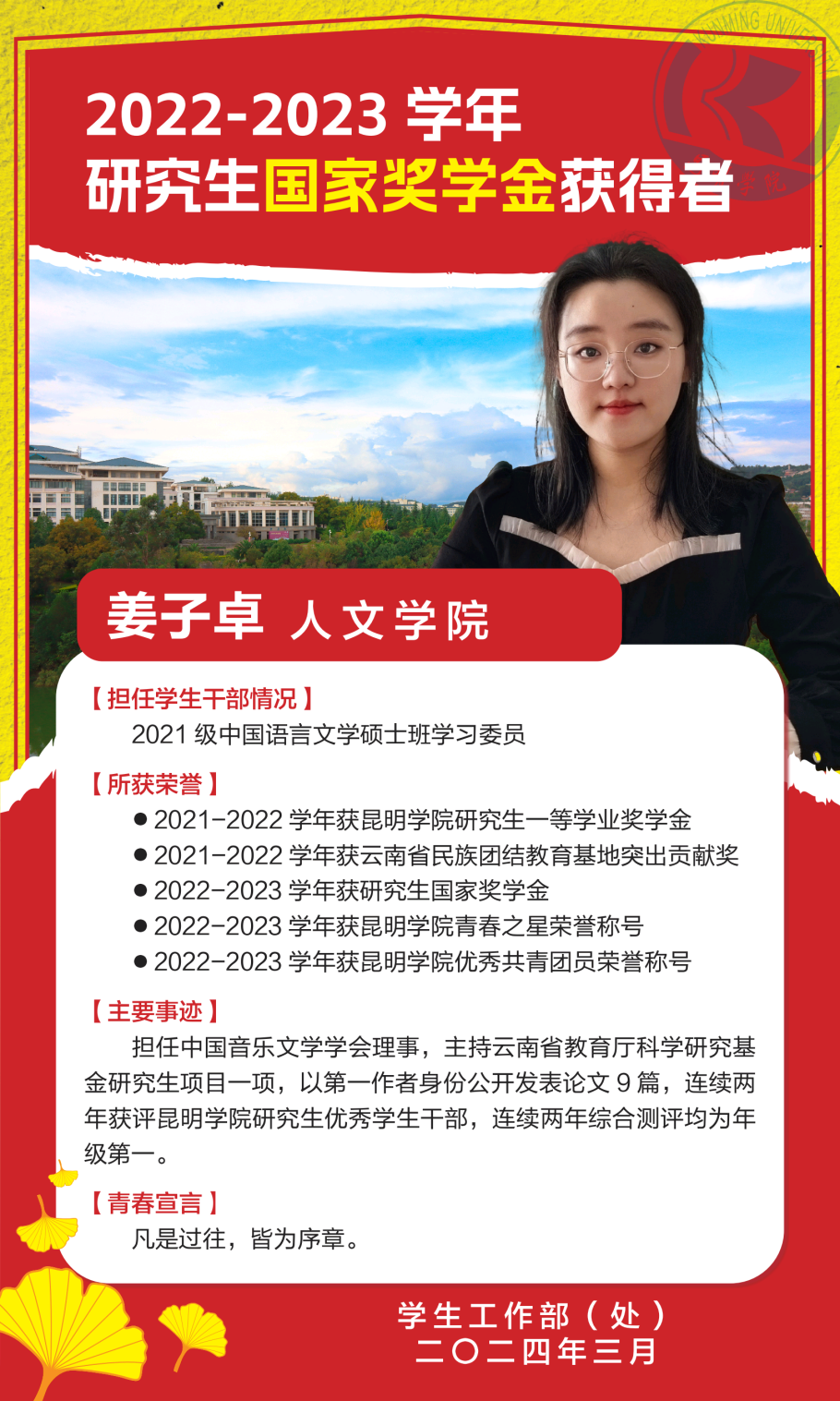 入校学习以来,在民族文学方向老师们的指导下,刻苦钻研、不断进步。在科研学习方面,连续两年综测成绩均名列年级第一,已在国家级刊物、省级论文集中以第一作者身份公开发表论文10篇(独撰),并为中国知网、都市时报等平台收录,主持云南省教育厅研究生项目《新时期云南少数民族诗歌中的生态美学研究》,积极参加助教助研活动。在实践与服务方面,担任中国音乐文学学会理事、班级学习委员等职务,积极主动地为同学服务,高质高效地完成各项工作,连续两年获评williamhill官网“研究生优秀员工干部”;积极参加各项志愿活动,获评威廉希尔中国官网“优秀志愿者”;注重全面发展,擅长钢琴、吉他等;作为朗读者参加我国教育部2022年度“读懂中国”获奖征文录制,并在中国教育电视台等平台同步展播;积极参与民族团结事业建设,获“云南省民族团结教育基地突出贡献奖”“williamhill官网年度青春之星”(民族团结之星)等荣誉。