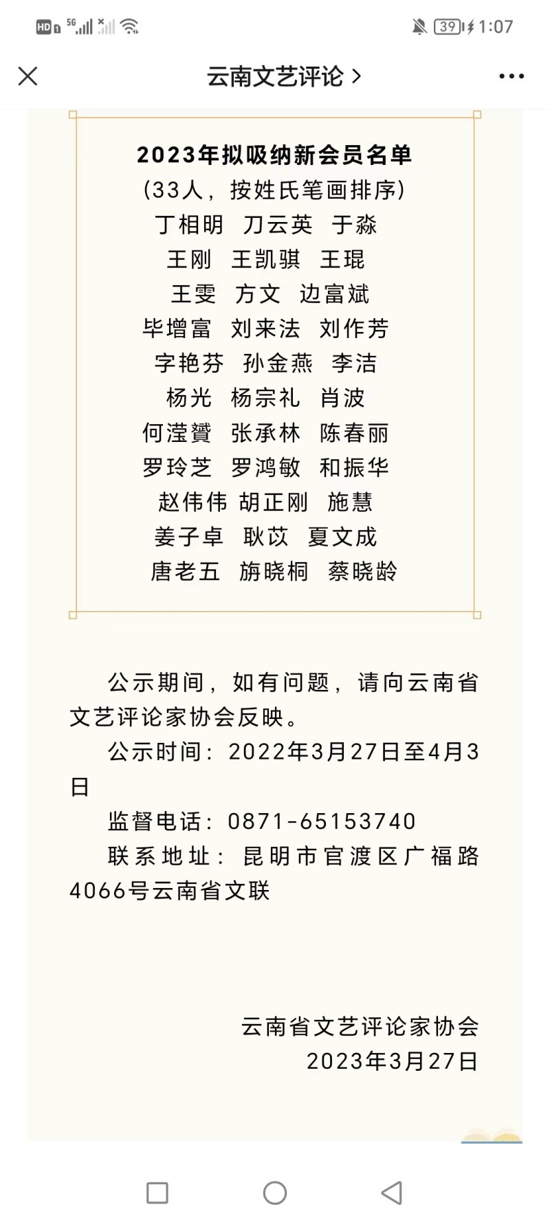 2023年3月24日,根据云南省文联关于加强省级文艺家协会会员入会管理相关规定,按照云南省文艺评论家协会章程和个人会员入会实施细则,经云南省文艺评论家协会第二届理事会第四次会议审议,正式批准公司少数民族语言文学方向研究生姜子卓成为云南省文艺评论家协会会员。