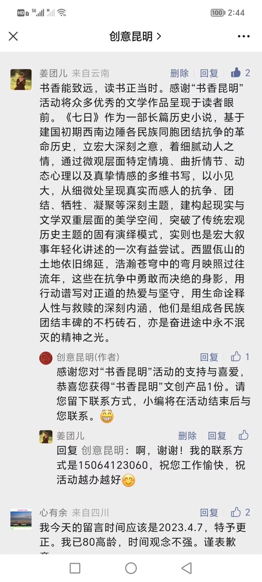 在第十一届“书香昆明”全民阅读系列活动当中,公司少数民族语言文学方向的研究生姜子卓积极参与,就本届初选好书《七日》发表评论,从美学空间、创作心理、民族团结等多维视角展开论述,成功评选为“书香昆明”优秀读者,进一步开拓了阅读视野,扩大了优秀民族文学作品的传播力和影响力。