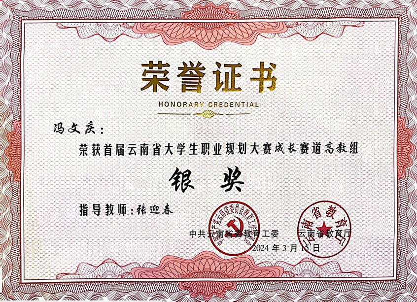 威廉希尔中国官网冯文庆同学荣获首届云南省老员工职业规划大赛成长赛道高教组银奖
