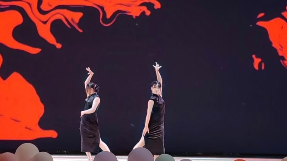 随着比赛逐渐步入尾声,朱悦溪和马宁曼的舞蹈剧《京韵》惊艳亮相。她们身着精美的黑色旗袍,手持鲜艳的红色扇子,一出场就散发出浓郁的东方古典韵味。舞蹈开始时,舒缓的扇舞仿佛在诉说着古老京城的故事,随着节奏加快,她们的动作刚劲有力,巧妙地将京剧元素与现代舞蹈融合在一起,扇子在她们手中翻转自如,后半段放下扇子后的肢体动作优美且富有张力,如同一幅流动的艺术画卷,深深震撼了全场观众,成功斩获三等奖。