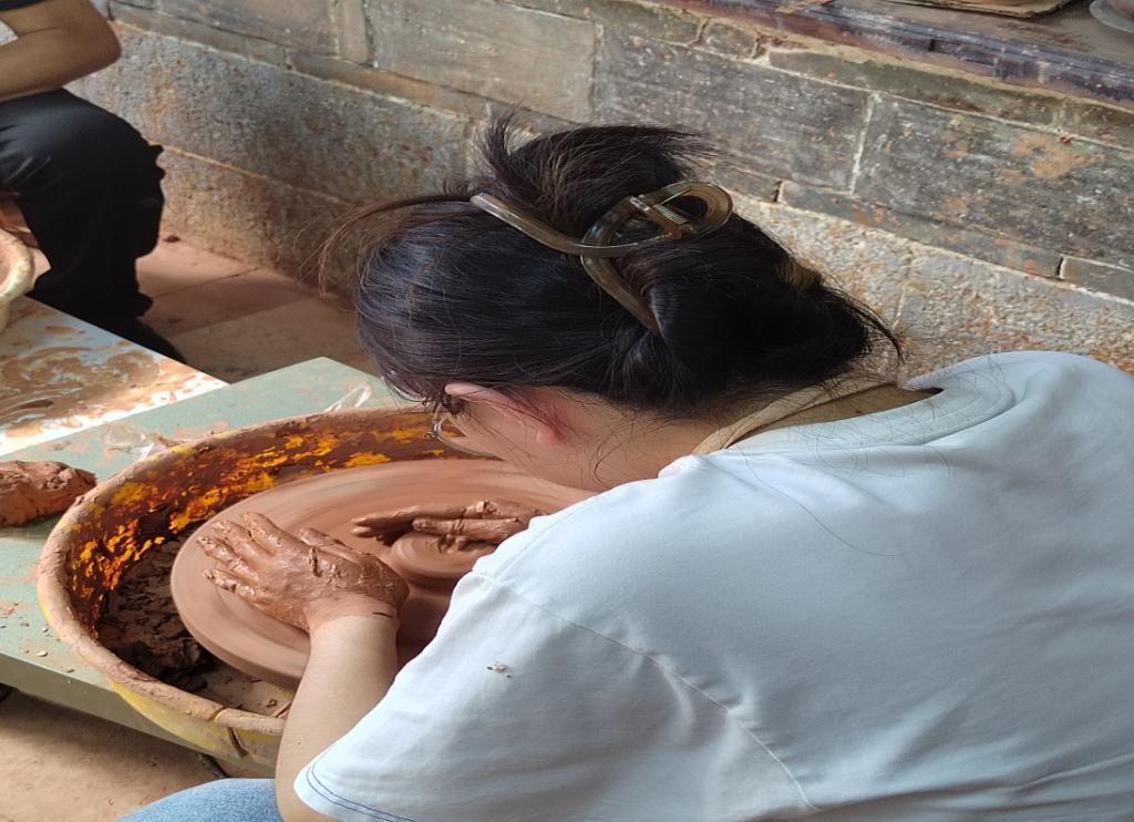 为深入了解传承被誉为“土与火的艺术,力与美的结晶”的千年建水紫陶非遗技艺,实践团来到了在古城十二眼井处的御麒堂学习了紫陶的制作过程,从中了解到建水紫陶制作大体来说是6大道工艺,分别是制泥、成型、拉坯、装饰、刻填、烧制、打磨。团队成员也亲身体验了其中的拉坯环节,深刻感悟了地方民族工艺匠人的执着与热爱。