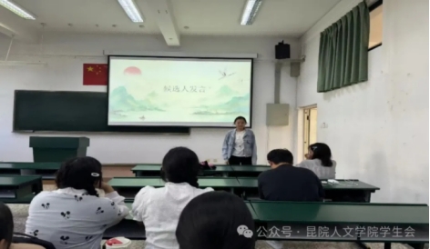 在换届工作的开始,春秋文化社社长耿羽含对一年以来春秋文化社举办的活动进行了总结与回顾。过去的一年里,春秋文化社成功举办了“予书以梦,以书传善”校园公益优秀摄影作品分享、“看电影学历史”观影活动、历史名词大会等活动,极大地彰显了春秋文化社独有的历史古韵。随后,候选人先后上台发言,阐述自己的竞选理念和工作计划。发言完毕之后,全体参会人员进行投票。