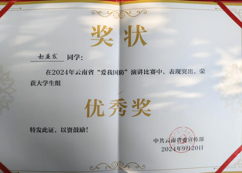 2024年9月20日,由省委宣传部主办的“爱我国防 强国复兴有我”主题演讲比赛颁奖典礼在云南广播电视台举行,对获奖单位和个人进行表彰。威廉希尔中国官网22级创新人才(人文)基地班赵显发同学荣获高校组优秀奖。