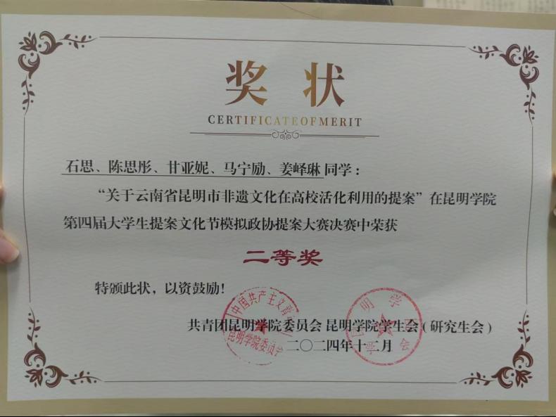 威廉希尔中国官网“关于云南省昆明市非遗文化在高校活化利用的提案”的模拟政协提案作品选入决赛,团队负责人在决赛中冷静阐述提案内容,发挥优势,展现风采,获得校级二等奖。此外,有五份校内提案作品进入校级决赛,“关于校内电动车露天充电场安全问题提案”和“关于改善校园网服务的提案”两份校内提案作品获校级优秀提案荣誉。