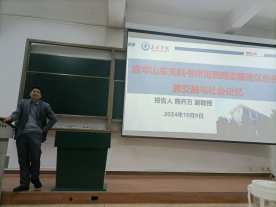 最后,熊开万副教授对本次讲座做了总结:哀牢山车夫科书是一类非常独特的民间仪式文本,是哀牢山民众的百科全书,反映了哀牢山民众对国家发展的想象,反映了中华民族文化的统一性,反映了民族的交流与融合。中华民族共同体意识核心内容的交流交往交融意识、民族平等意识、团结奋斗意识,正是在像哀牢山车夫科书中体现的地方性知识与社会记忆的基础上产生的知识和感觉结构,这种知识与记忆的形成!是中国历史的整体性和中华民族的整体性在边疆社会运行的结果。