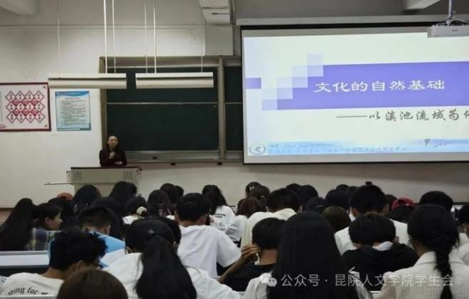 冯老师从“区位优势、地貌特征、气候类型、河流湖泊和自然景观”五个方面深入讲述了滇池流域文化的自然基础。她认为,滇池流域的区位优势,使其在历史发展进程中逐步成为区域发展的核心,影响了春城文化的发展;典型的山间盆地地貌,提供了滇池流域人类聚落形成与发展的优越地域空间,形成了周边民族独特的文化习俗和艺术表现形式;滇池流域冬无严寒、夏无酷暑的气候特点,使昆明在诸多具备该气候特点的城市中获得“春城”的美誉;滇池承载了湖泊水体发育的自然发展历史轨迹,是一部记载了湖泊演化发展的活的“历史书籍”。