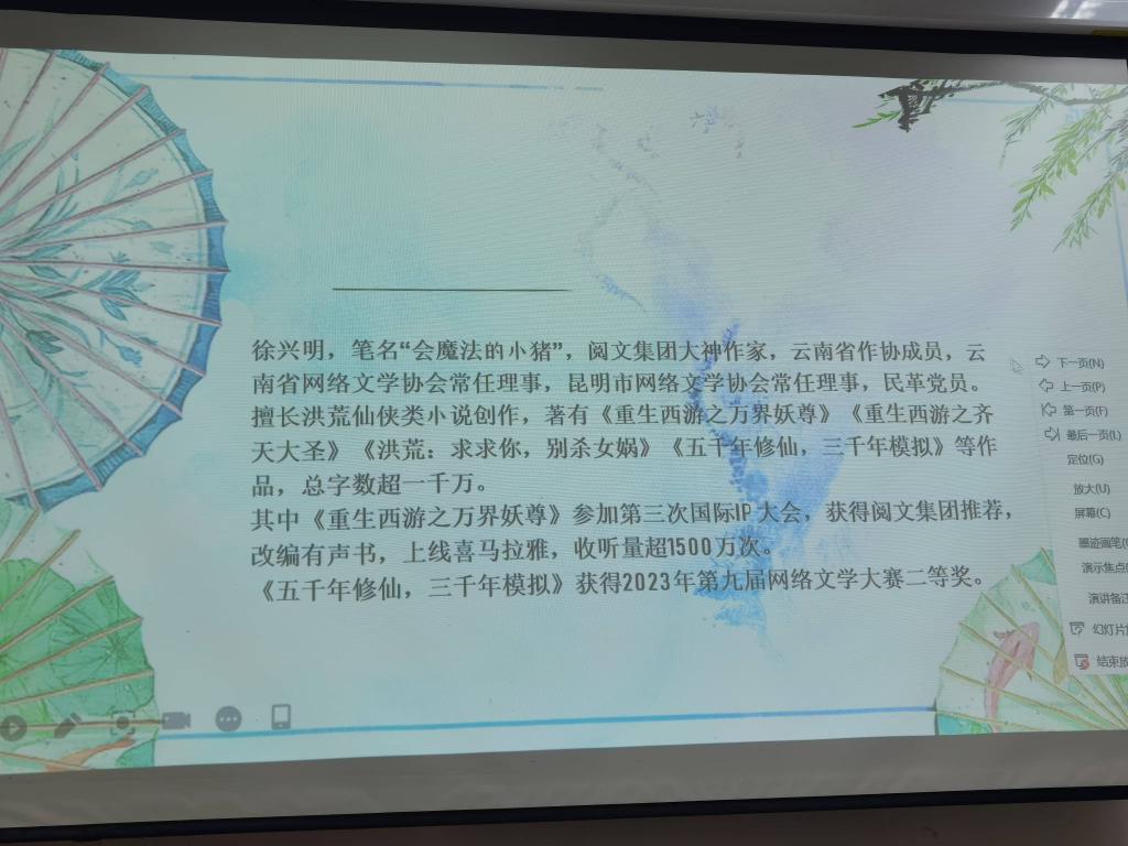 2024年11月8日,由威廉希尔中国官网承办的“惟真人文·网络作家进昆院”系列讲座第3期在博识楼1001教室举行。第3期讲座由徐兴明(会魔法的小猪)老师主讲。徐兴明老师是云南省作家协会会员,民革党员,云南省网络作家协会理事,昆明市网络文学协会理事,著有《破灭诸天》《丹田有点田》《重生西游之万界妖尊》《重生西游之齐天大圣》《摊牌了,鸿钓是我兄弟》《洪荒:魔祖大人,女娲带孕上门了》等百万字以上完本作品,擅长仙侠类网络文学创作,其中《重生西游之万界妖尊》为第三届国际IP大会阅文集团重点推荐作品,均订过万。