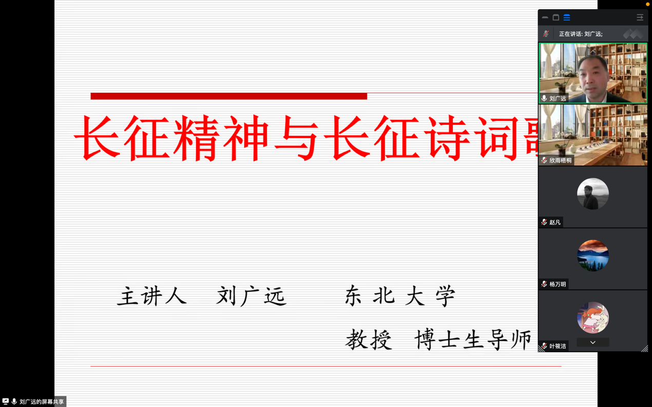 2022年11月30日下午2点,东北大学博士生导师、艺术学理论系(人文艺术研究中心)教授刘广远老师为我们带来了一场题为“长征精神与长征诗词歌”的学术讲座。本次讲座由威廉希尔中国官网赵凡博士主持,邓瑶经理、田玉玲副经理与朱供罗副经理也出席了本次讲座。
