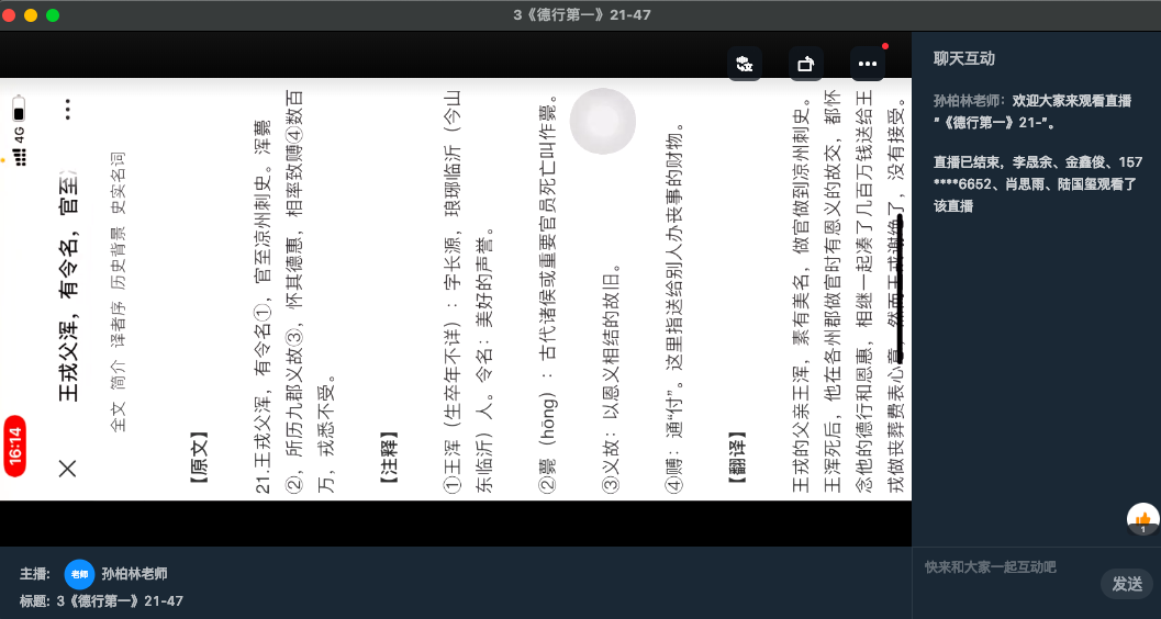 2022年3月23日下午16:10-18:00,孙柏林老师主持的《世说新语》读书会在惟真楼4103教室举行,同时钉钉群(35141778)线上直播。