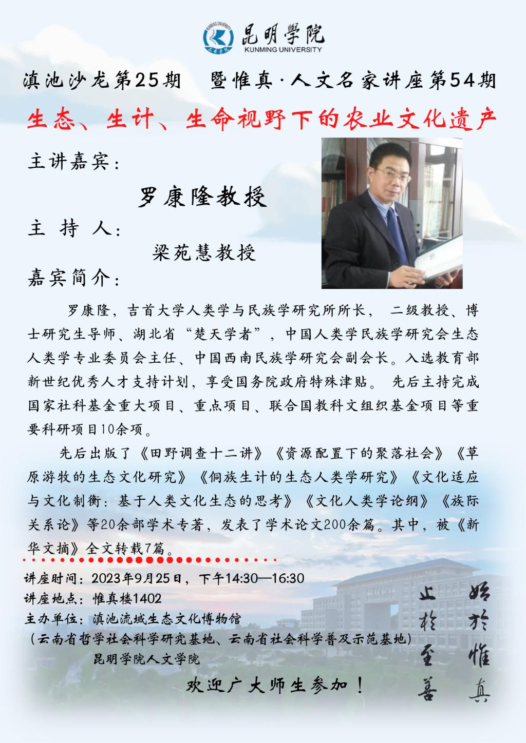 罗康隆教授主讲滇池沙龙 第25期 暨惟真·人文名家讲座第54期,欢迎参加