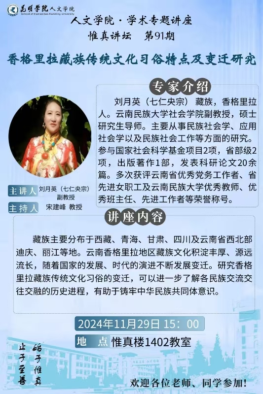 刘月英(七仁央宗)教授主讲惟真·人文学术讲坛第91期,欢迎参加!!