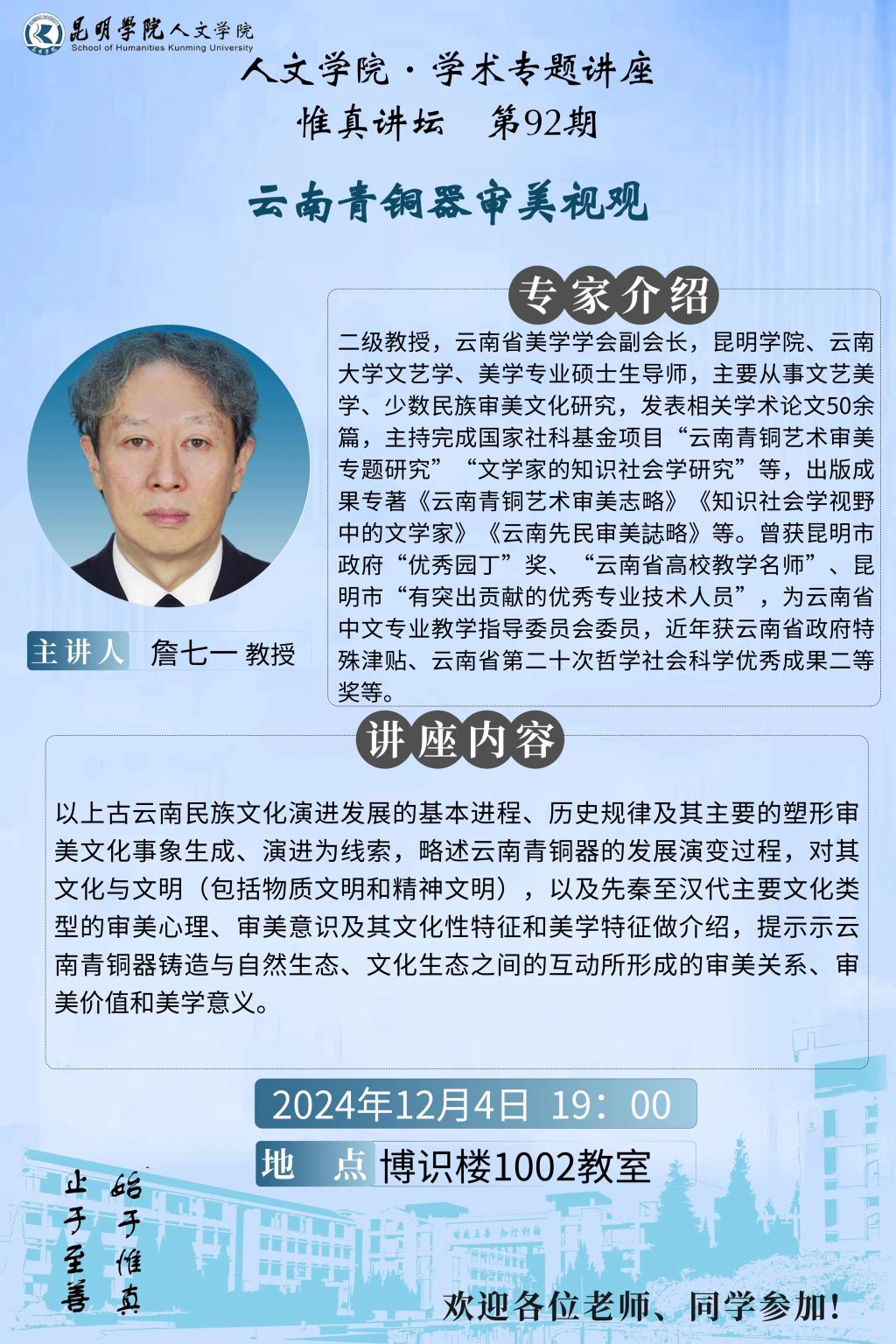 詹七一教授主讲惟真·人文学术讲坛第92期,欢迎参加!!