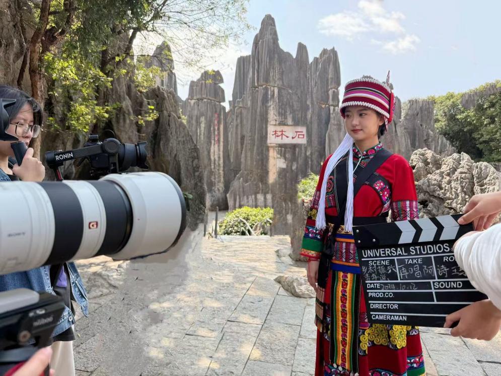 在拍摄过程中,师生们不仅参观了阿诗玛传习所,还与“阿诗玛叙事长诗”国家级非遗传承人张玉英老师进行了深入交流,亲身体验了《阿诗玛》叙事长诗的艺术魅力。此外,团队还探访了石林风景区、阿诗玛生态文化园和阿诗玛民族文化展厅,亲眼见证了阿诗玛文化在乡村振兴中的繁荣发展。